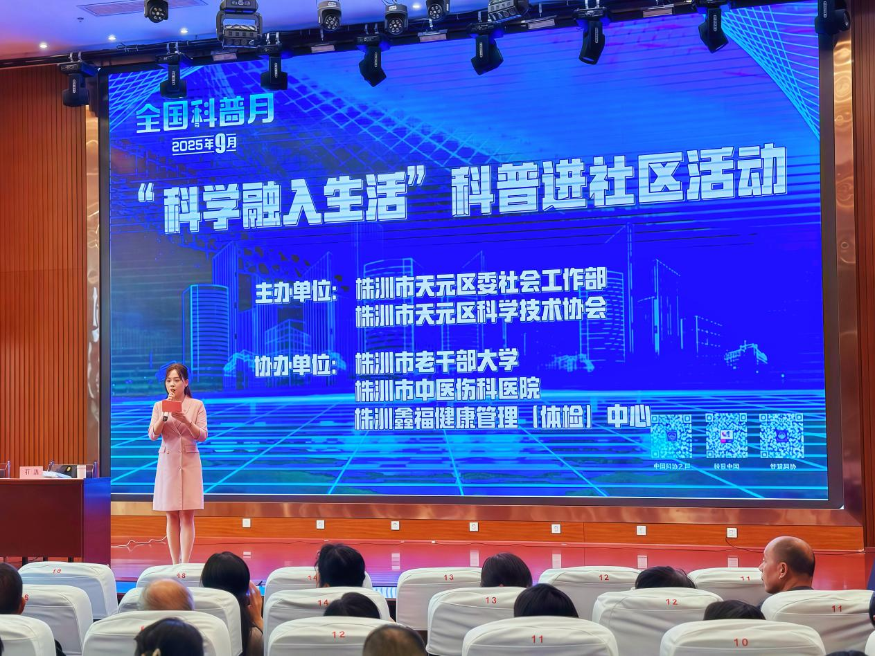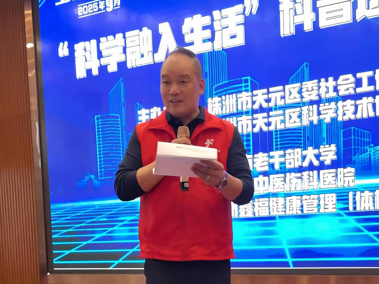 9月26日下午,由株洲市天元区委社会工作部、区科学技术协会主办,株洲市老干部大学、中医伤科医院、鑫福健康管理(体检)中心协办的“科学融入生活”科普进社区活动在株洲市老干部休养活动管理中心成功举行?;疃匮泄蒲г豪峡蒲Ъ铱破昭萁餐鸥蓖懦な诮淌谥鹘?,吸引了260余名社区居民和志愿者参与。