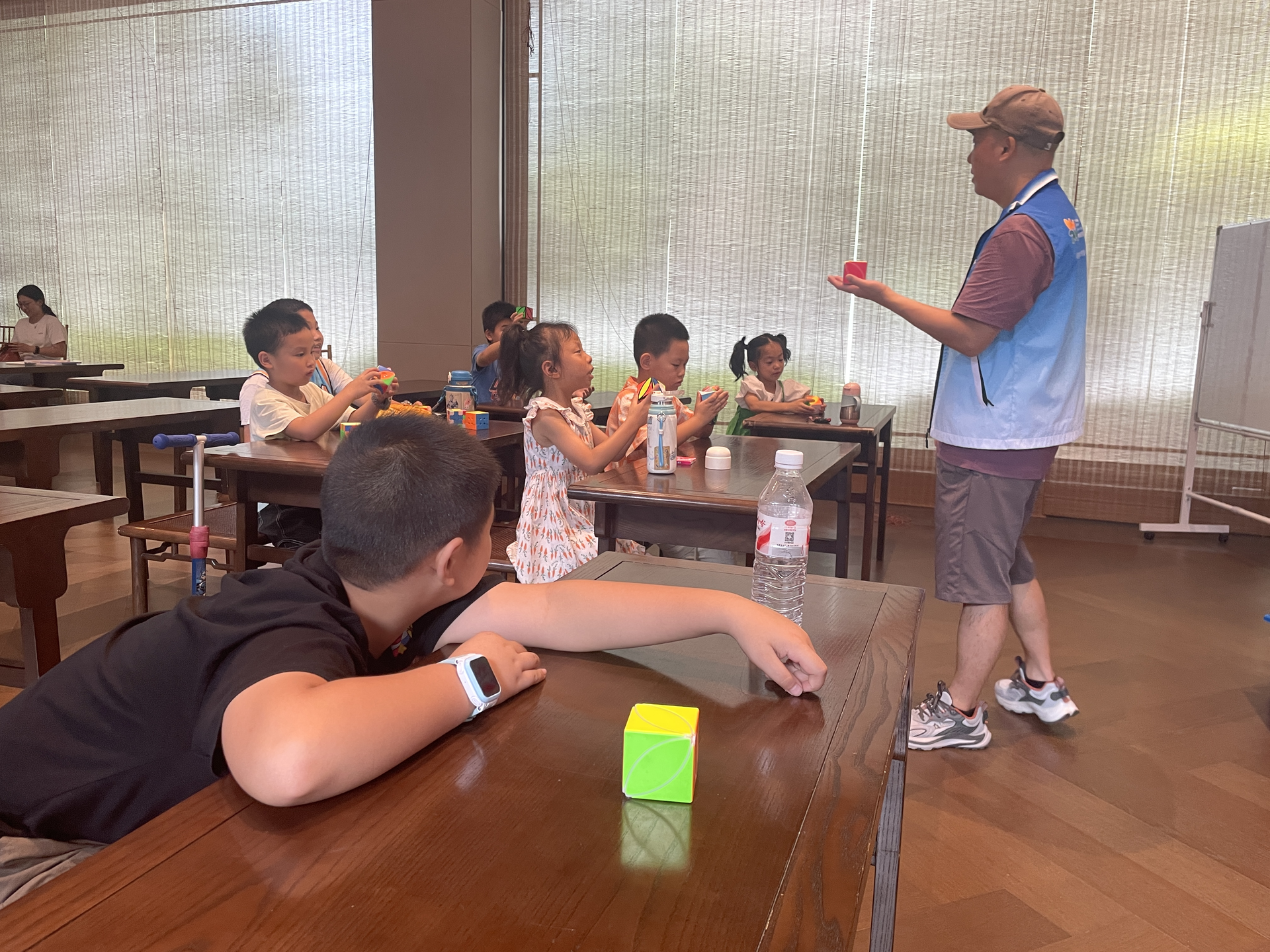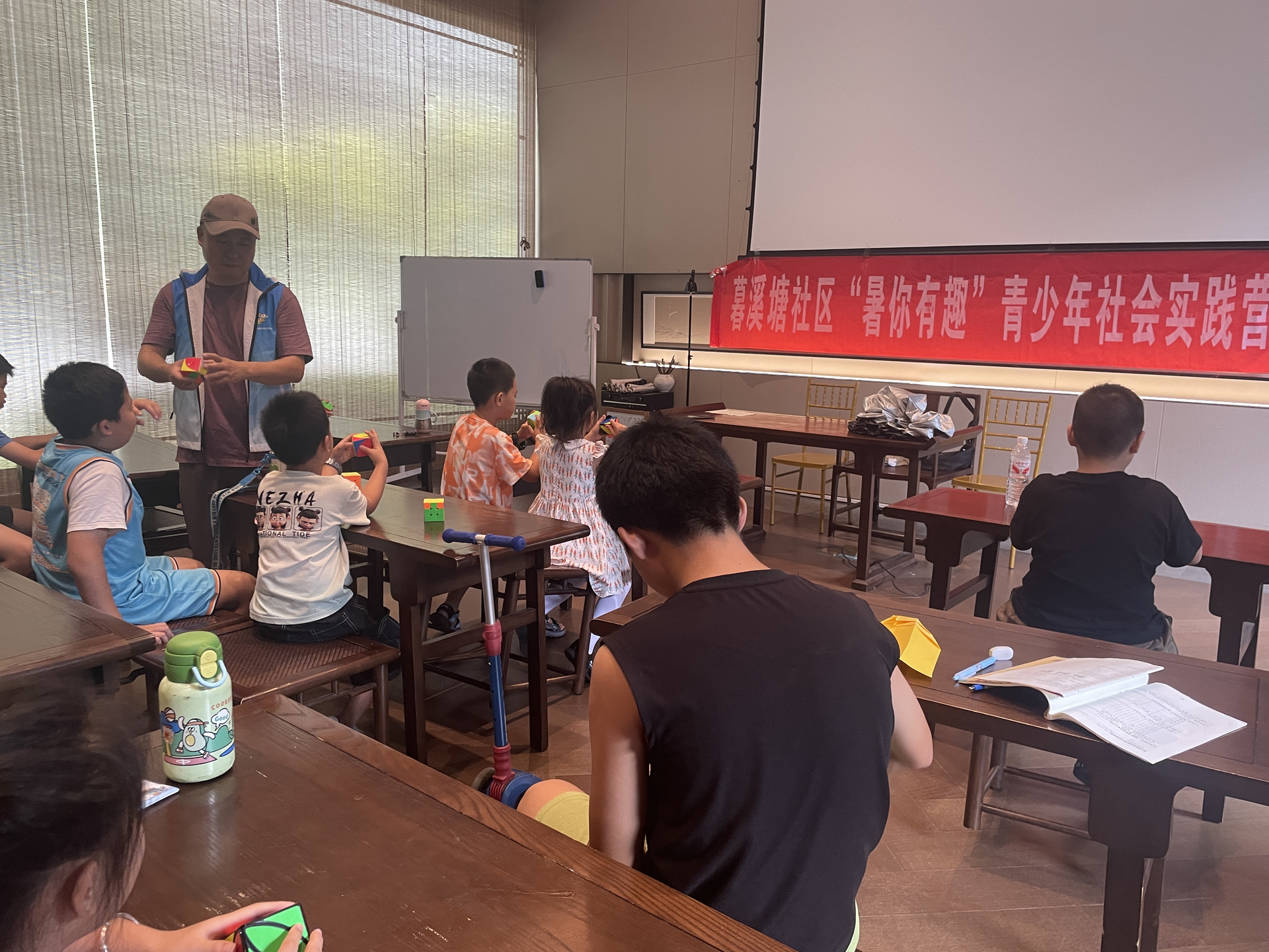 暮溪塘社区“暮邻同心”志愿服务队为社区托管班孩子带来妙趣横生的魔方公益课??纬桃陨绞揭继剿髂Х桨旅?,通过耐心讲解步骤、鼓励实践,培养孩子空间想象与逻辑思维能力,激发科学探索热情。