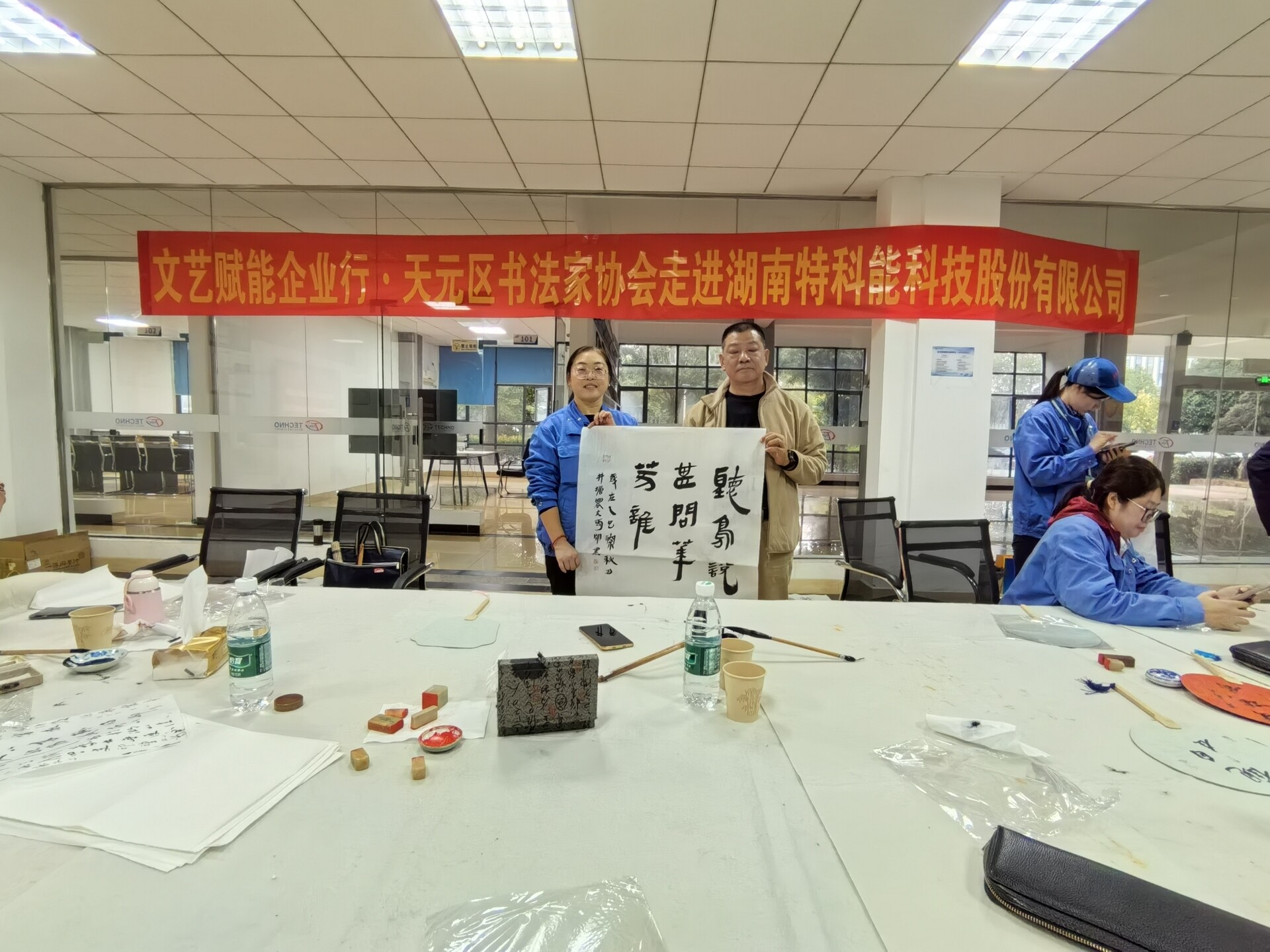 秋阳煦暖,墨韵传情。为践行文艺服务人民、赋能企业发展的宗旨,2025年10月31日下午,在天元区文联的指导下,天元区书法家协会携手湖南特科能科技股份有限公司,成功举办“送书法进企业”文化惠民活动。此次活动旨在促进书法艺术与企业文化的深度融合,为企业员工带来一场沉浸式的文化体验。